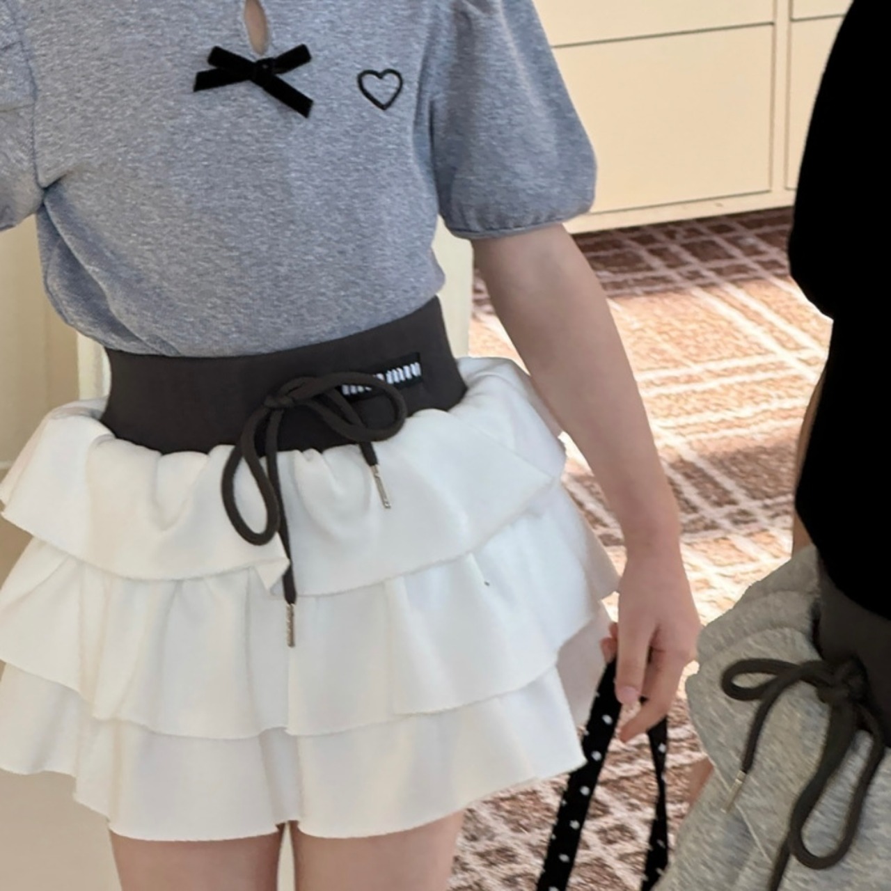 フリルのティーアードがガーリーなアクセントを加え、